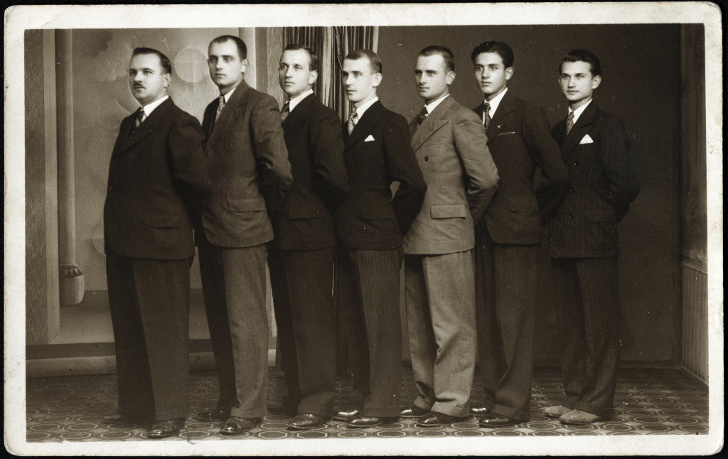 Apro-Foto műterem, Magyarkanizsa (St. Kanjiza), Vajdaság, elegáns férfiak egy sorban, Horthy-korszak, helytörténet, 1920-as évek, Eredeti fotó, pecséttel jelzett papírkép.