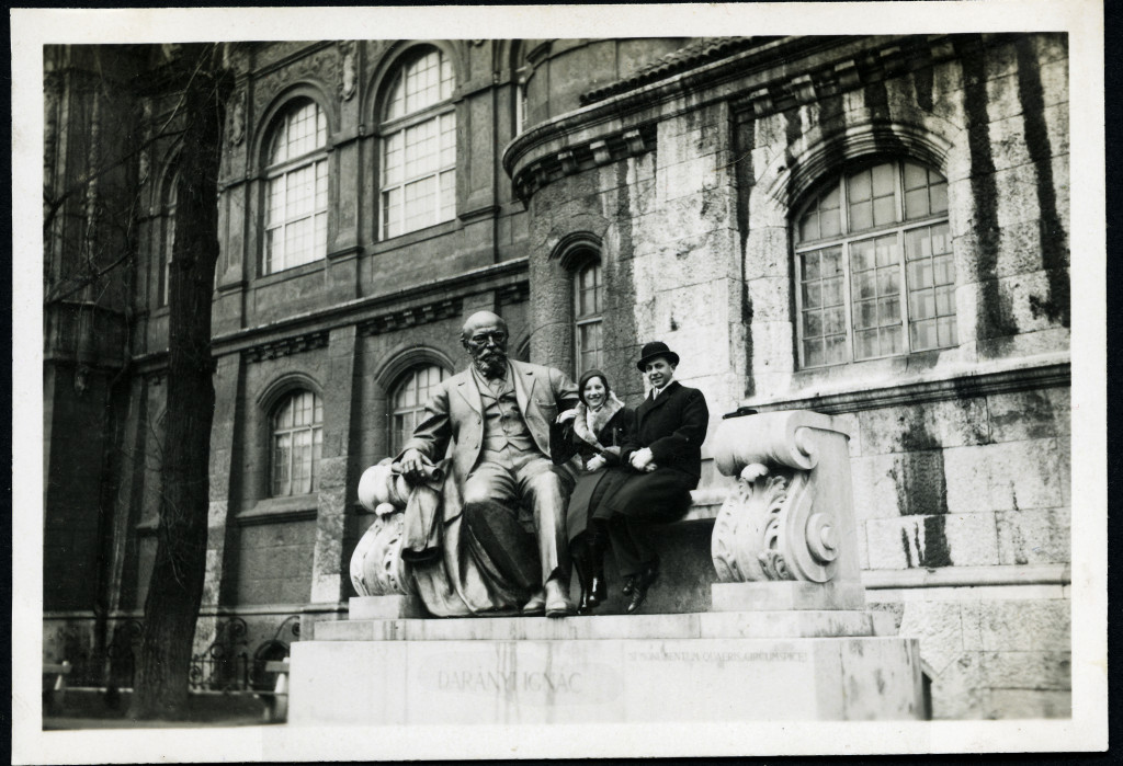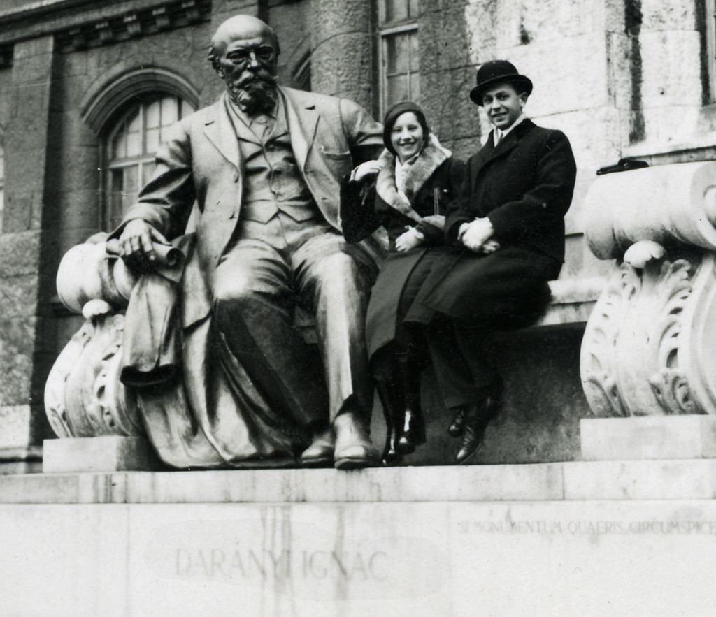 Elegáns pár Darányi Ignác szobra mellett, Budapest, országház, parlament, Horthy-korszak, 1930-as évek, Eredeti fotó, papírkép, hátulján ragasztásnyomok.