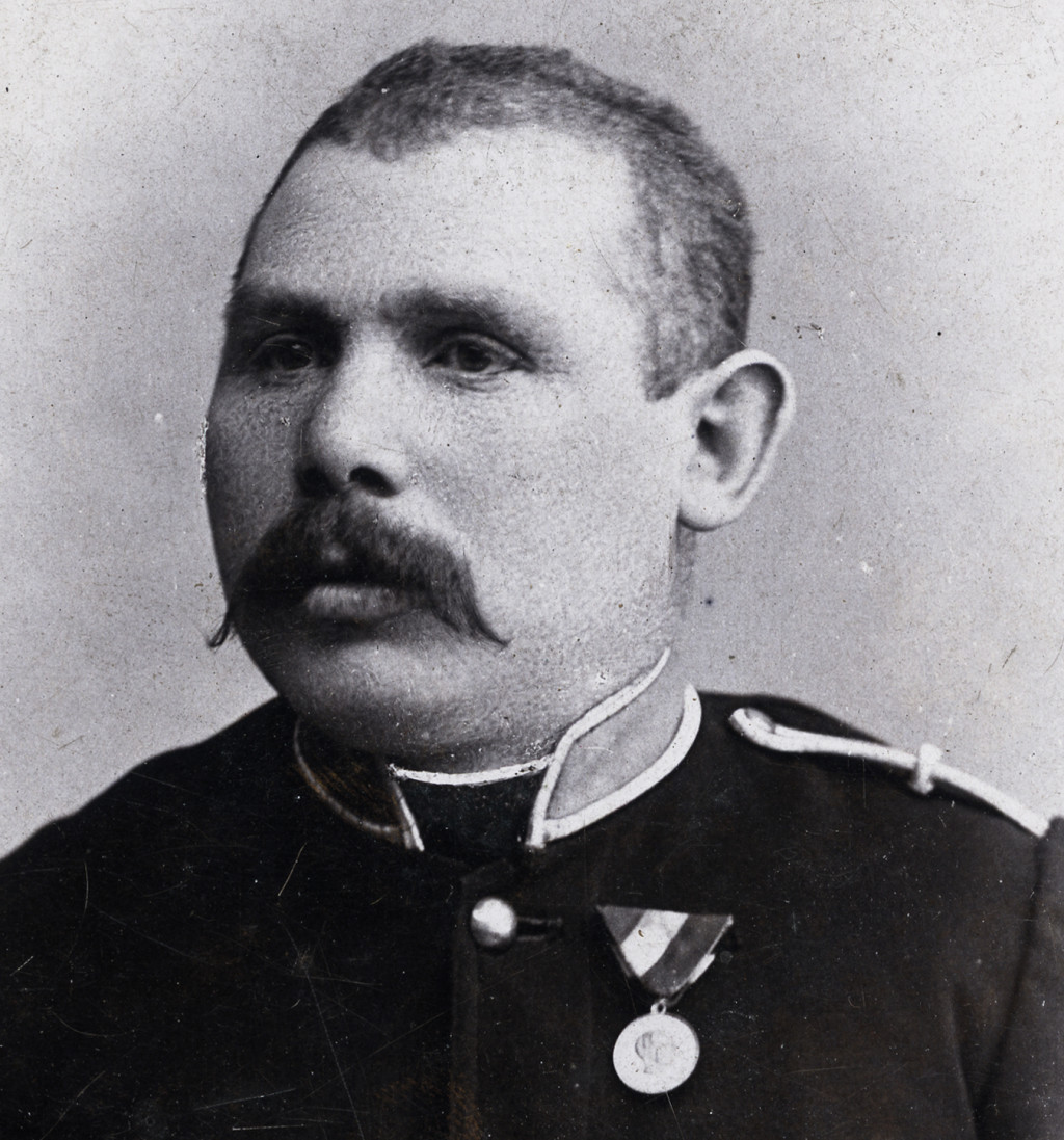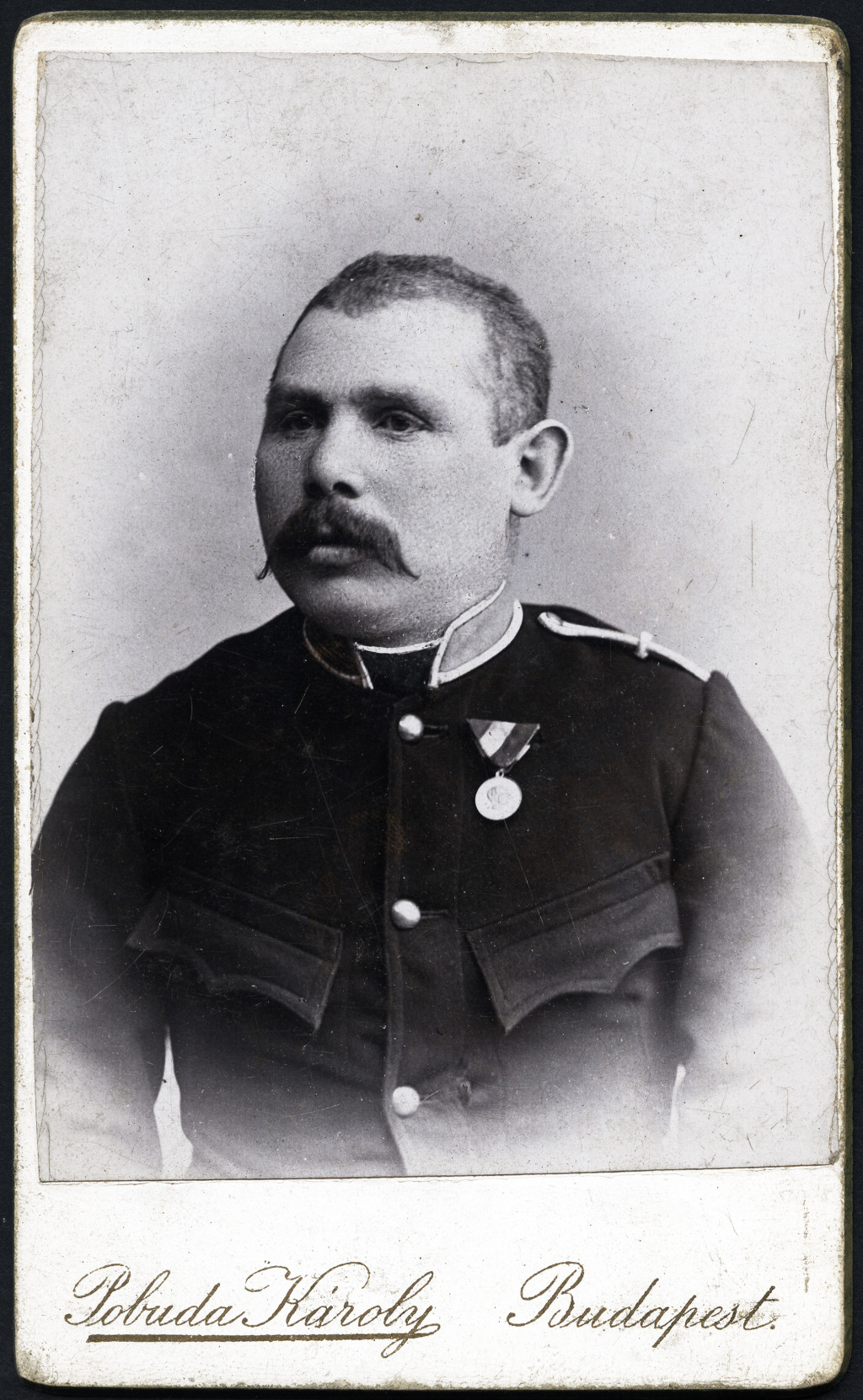 Pobuda Károly műterme, Budapest, magyar katona (rendőr?) egyenruhában, bajusz, érdemrend, kitüntetés, monarchia, 1890-es évek, Eredeti CDV, vizitkártya fotó.