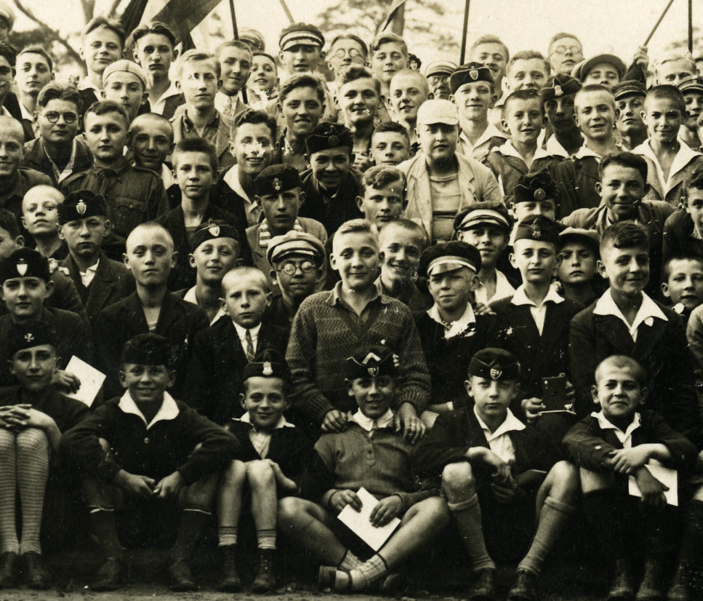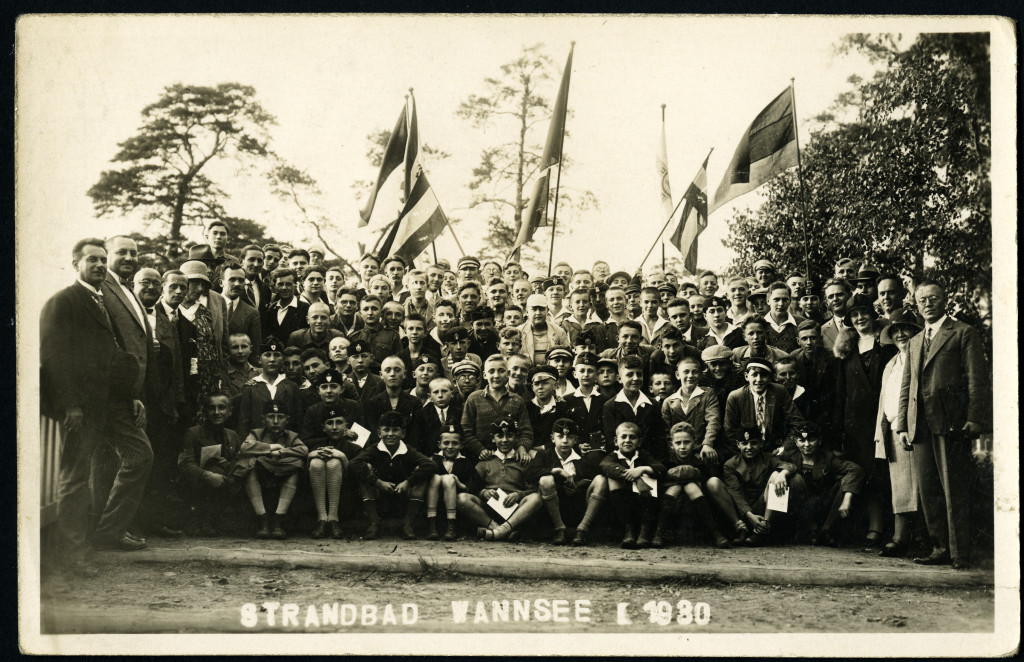 Magyar iskolás fiúk nemzetközi találkozón, Strandbad Wannsee, Németország, sapkajelvény, zászló, Horthy-korszak, 1930, 1930-as évek, Eredeti fotó, papírkép, feliratozott.