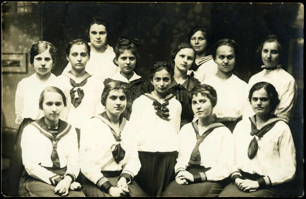 Vajda Sándor fényképész, Szabadka, Vajdaság, „Mezneristák”, iskolás lányok matrózblúzban, helytörténet, monarchia, 1910-es évek, Eredeti fotó, papírkép, hátulján feliratozott, jelzett.