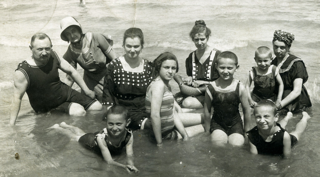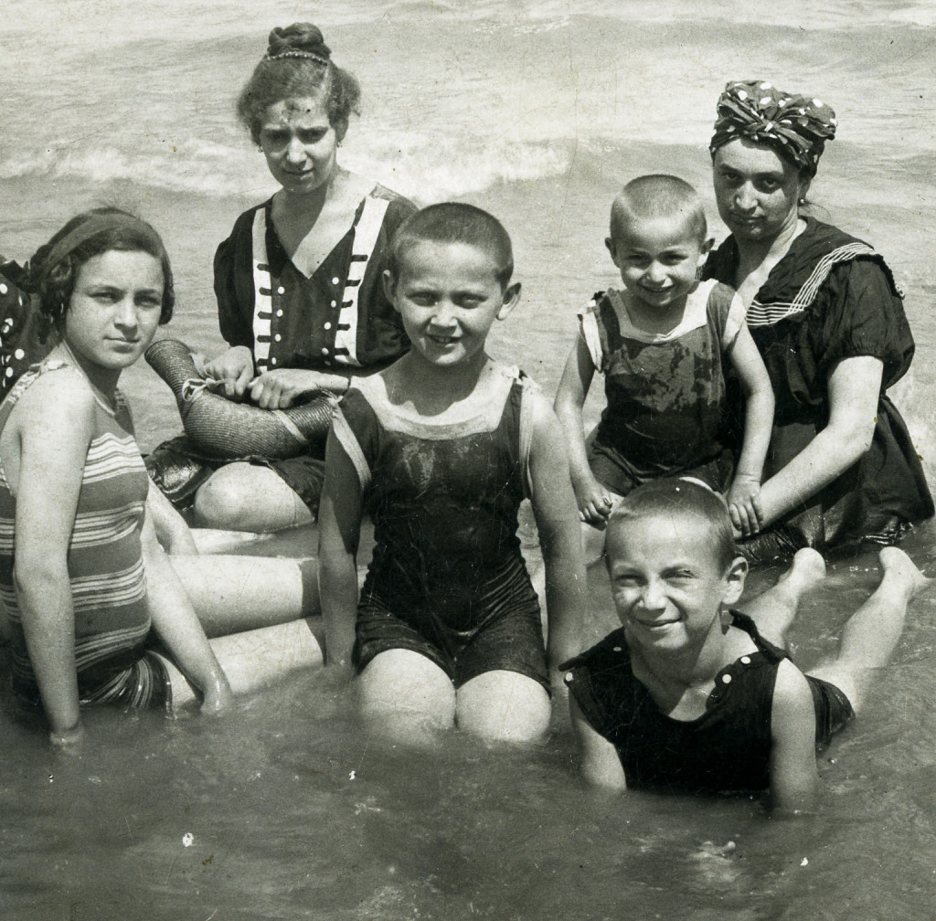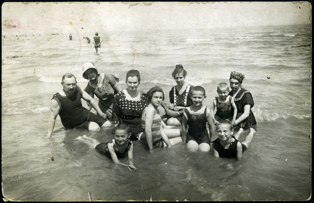 Ellinger Ede fényképész, Siófok, Fürdőtelep, fürdőző családok a Balatonban, fürdőruha, nyaralás, helytörténet, monarchia, 1916, 1910-es évek, Eredeti fotó, papírkép, hátulján feliratozott, jelzett.