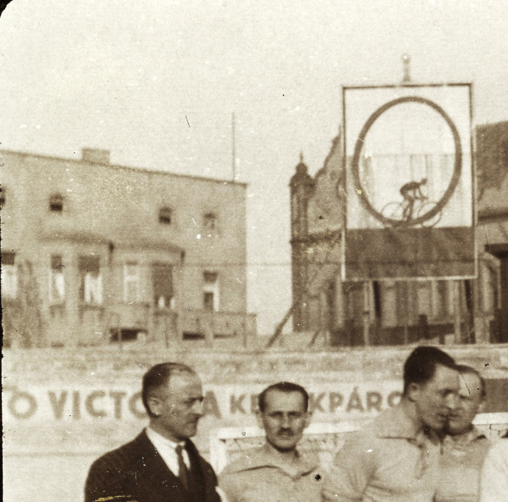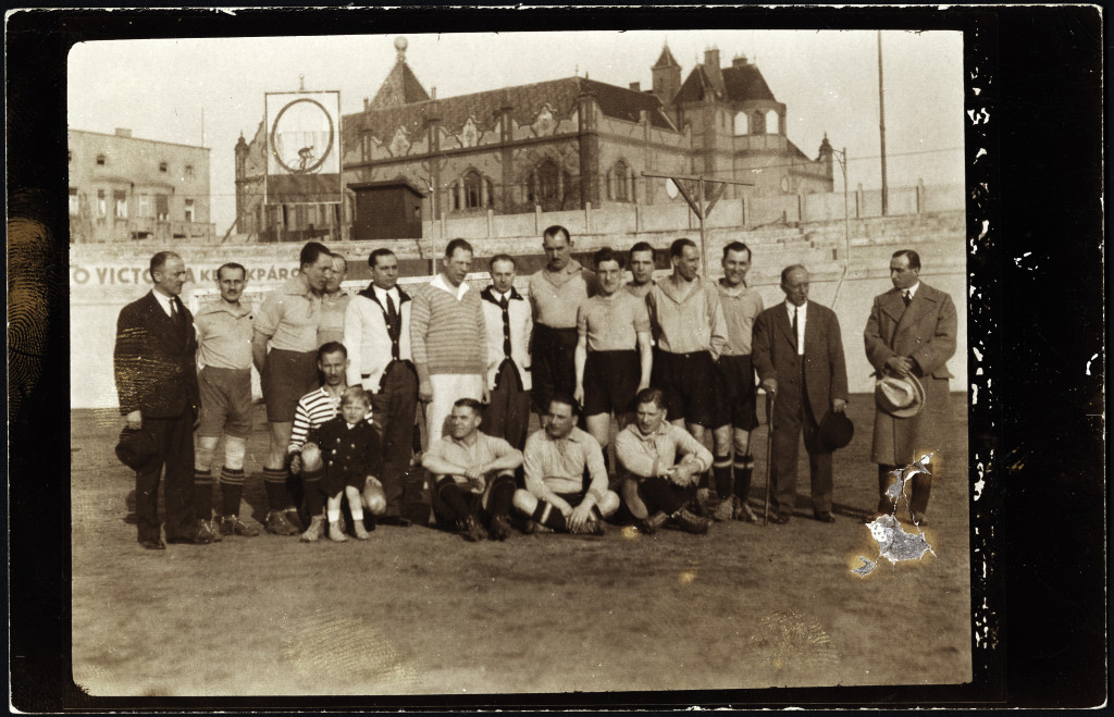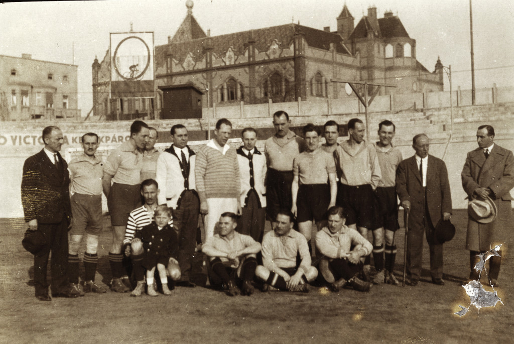 Millenáris sportpálya, Budapest, Zugló, focicsapat a pályán, labdarúgás, sport, Földtani Intézet, kerékpársport, reklám, helytörténet, monarchia, 1910-es évek, Eredeti fotó, papírkép, hátulja foltos.