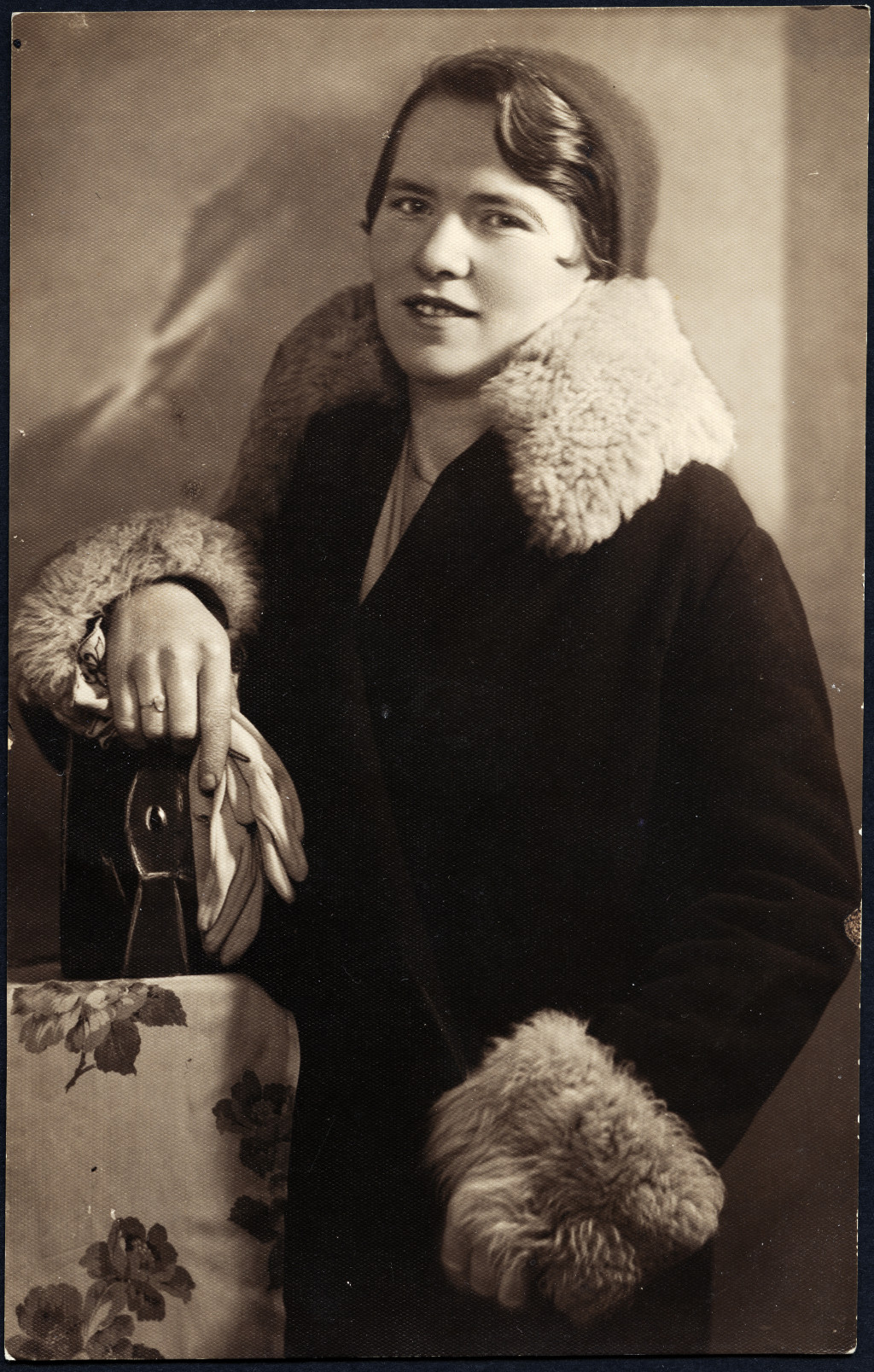 Weisz Gyula műterme, Aszód, elegáns nő télikabátban, divat, 1930-as évek. Eredeti fotó, hátulján pecséttel jelzett papírkép.