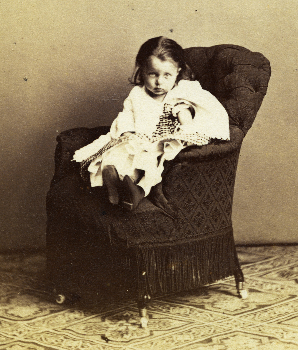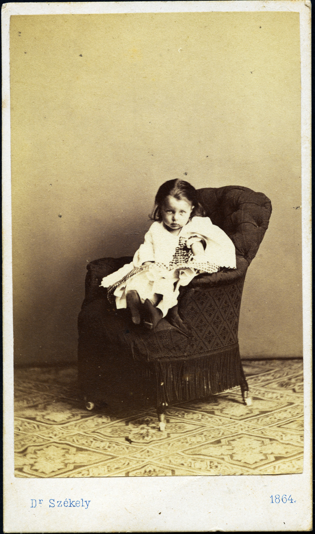 Korai Székely fotó, Dr. Székely József műterme, Bécs, Ausztria, elegáns kislány különös fotelben, 1864, 1860-as évek, Eredeti CDV, korai vizitkártya fotó.