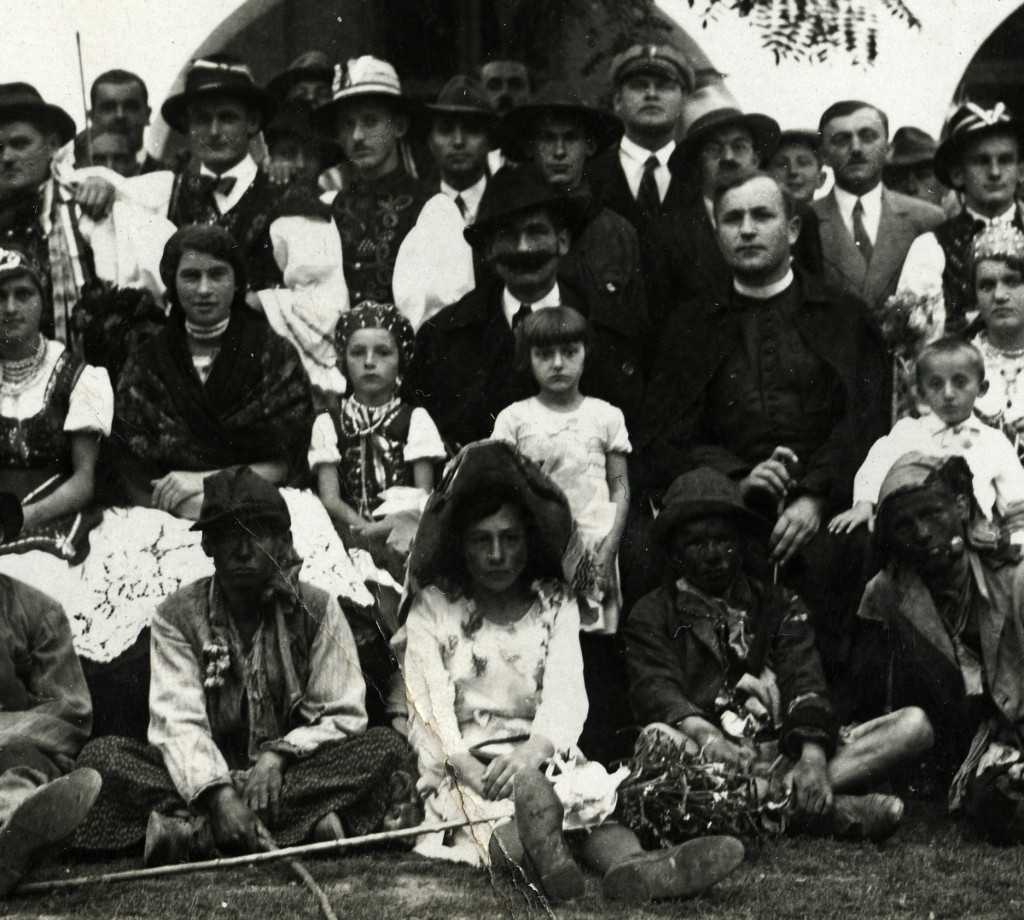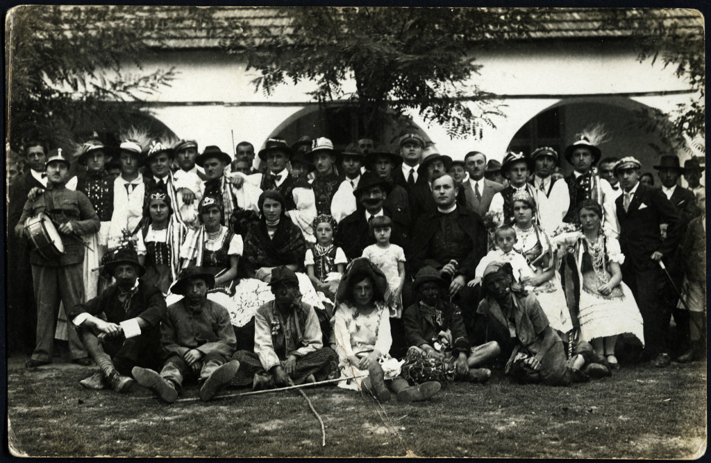 Tumpek Mester, Paks-Tolna, amatőr színészek jelmezben, vicces, színház, helytörténet, népszínmű, Horthy-korszak, 1938. IX. 17, 1930-as évek, Eredeti fotó, hátulján feliratozott, pecséttel jelzett papírkép.