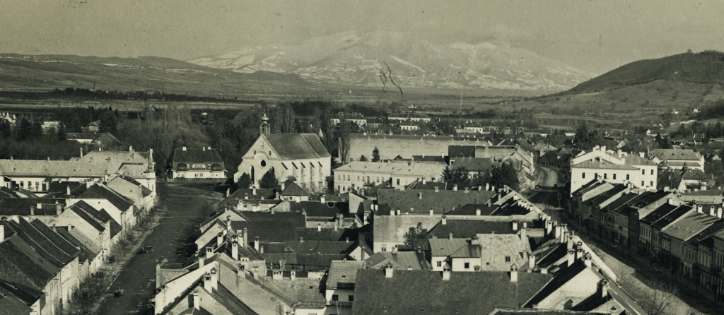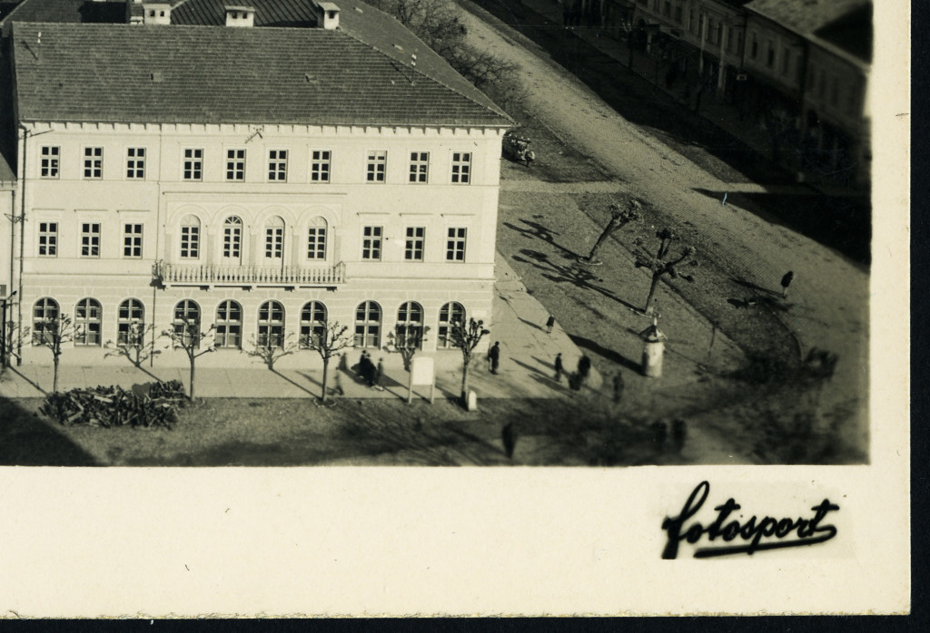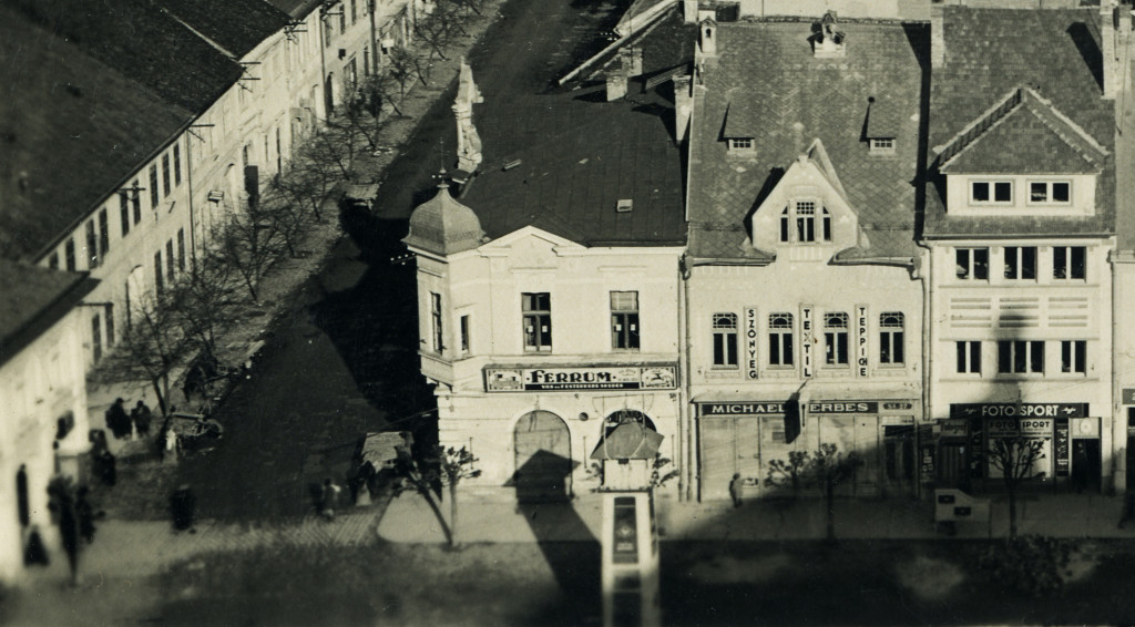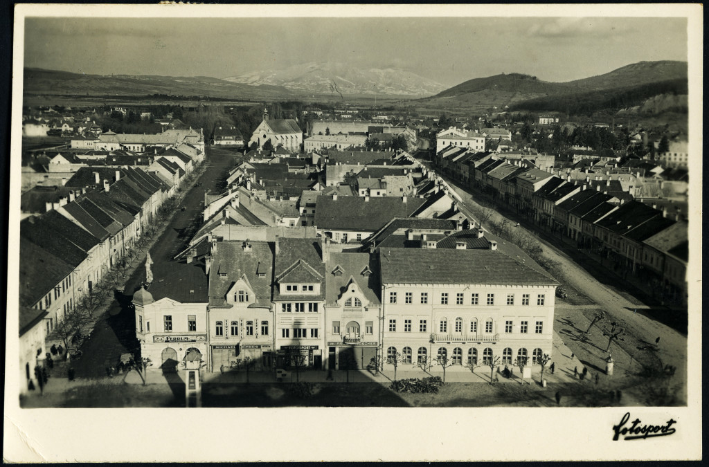 fotosport műterem, Beszterce, Erdély, városkép üzletekkel, kirakatokkal, magyar feliratokkal, reklám, helytörténet, Horthy-korszak, 1940-es évek, Eredeti képeslap fotó, hátulján feliratozott, jelzett papírkép.