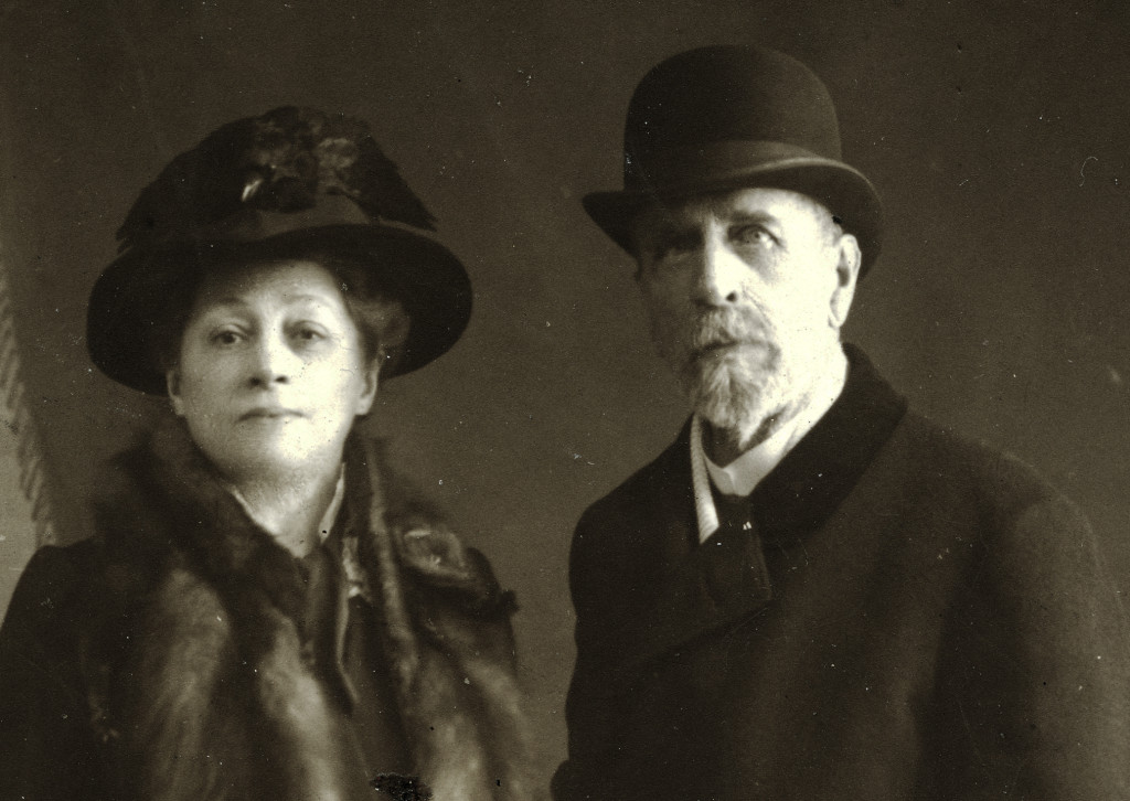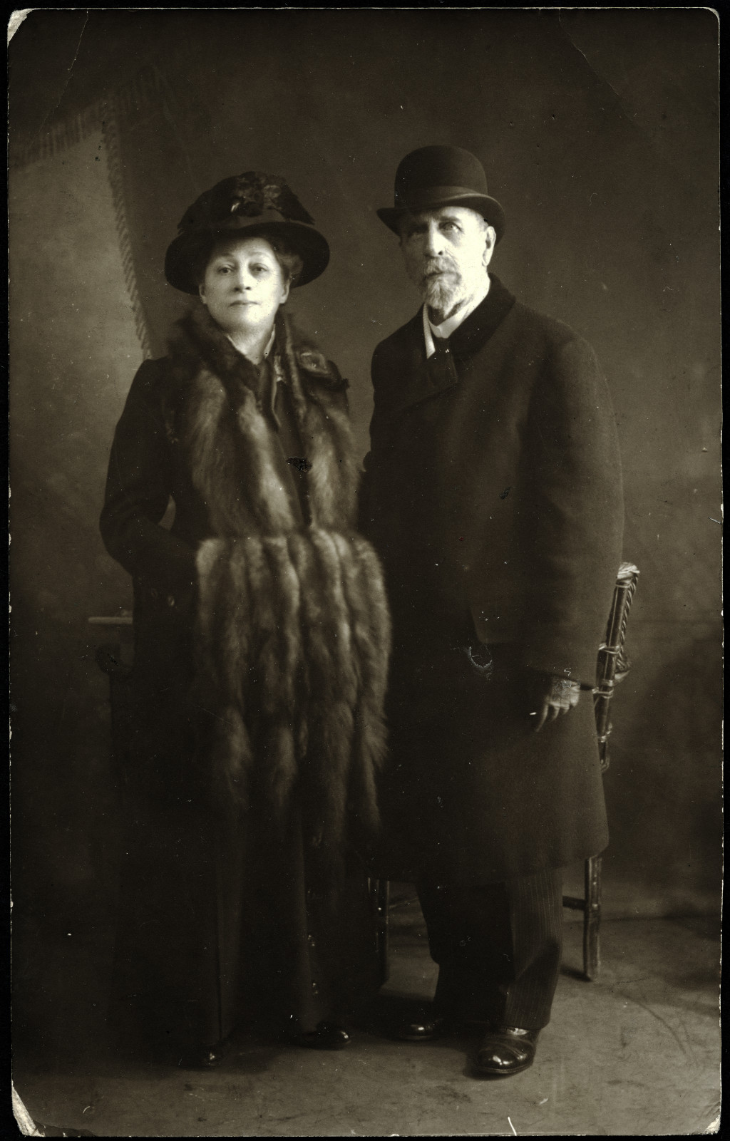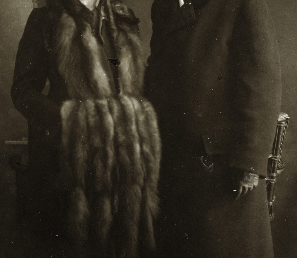 Foto-Lux műterem, Budapest, elegáns házaspár kalapban, bunda, prém, divat, szakáll, monarchia, 1910-es évek, Eredeti fotó, papírkép.