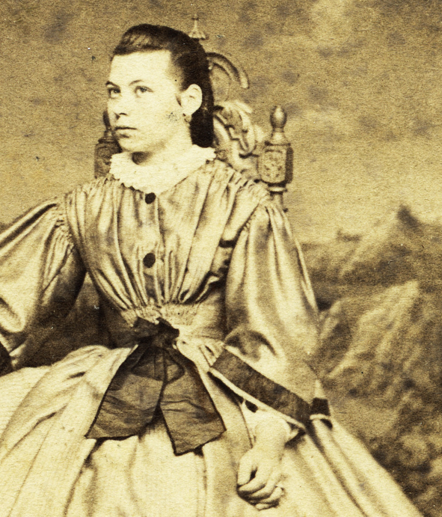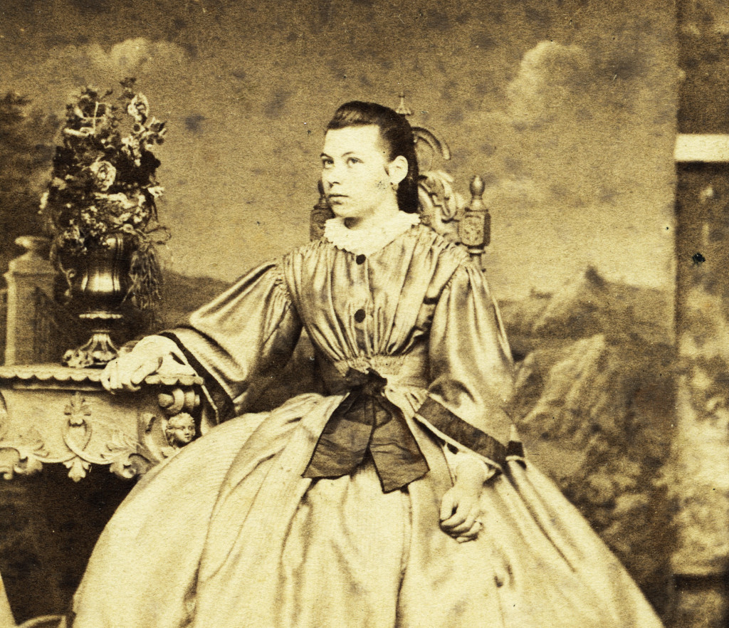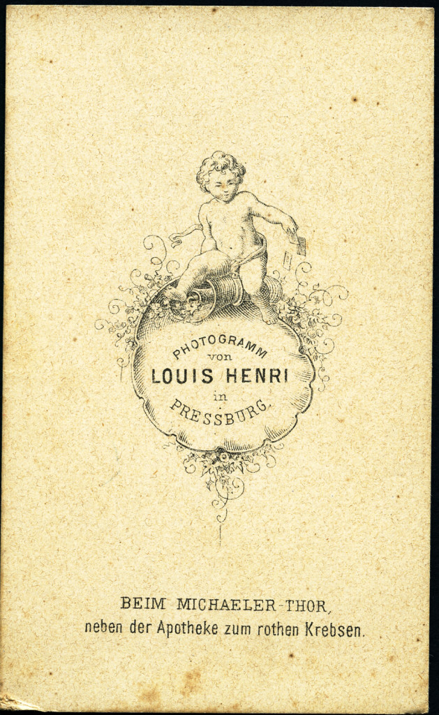 Louis Henri műterme, Pozsony (Pressburg), Felvidék, elegáns nő gyönyörű ruhában, különös festett háttér, portré, 1860-as évek, Eredeti CDV, korai vizitkártya fotó, ritka műterem, felszíne foltos.