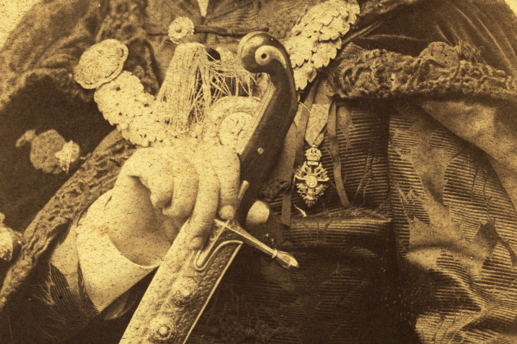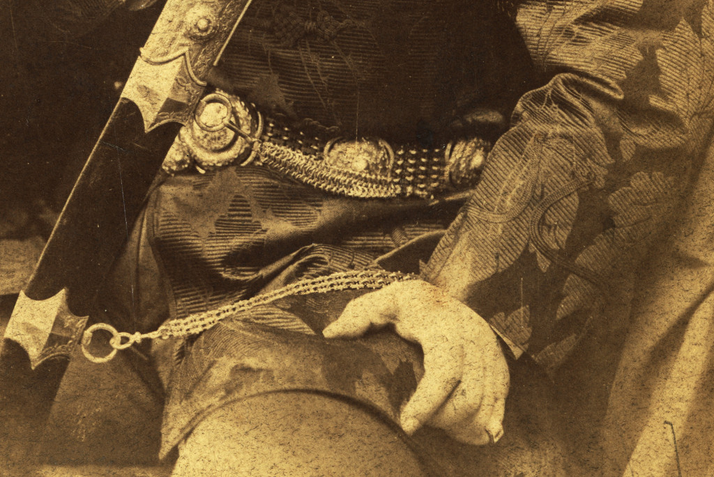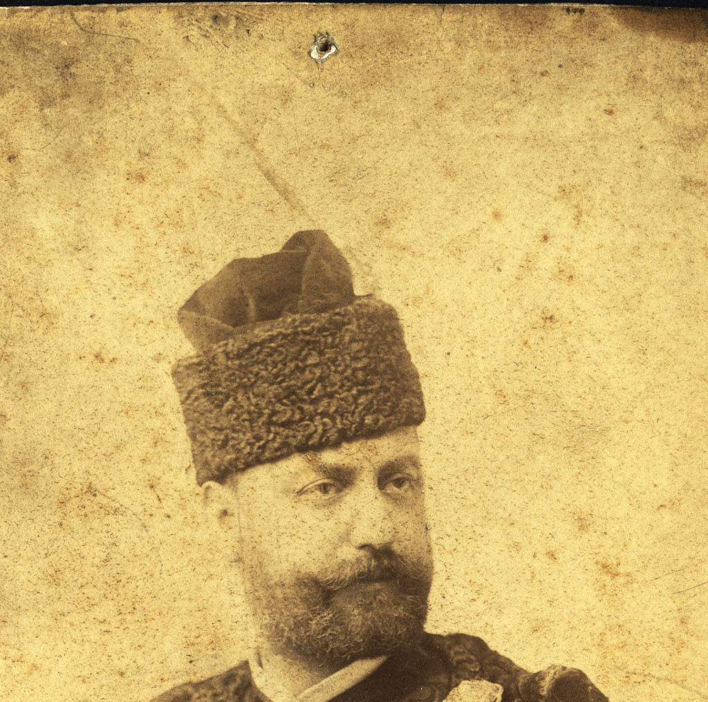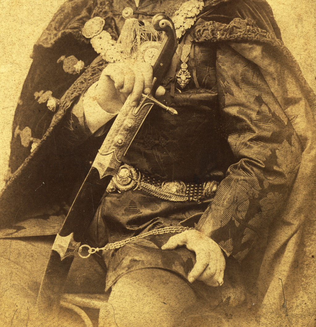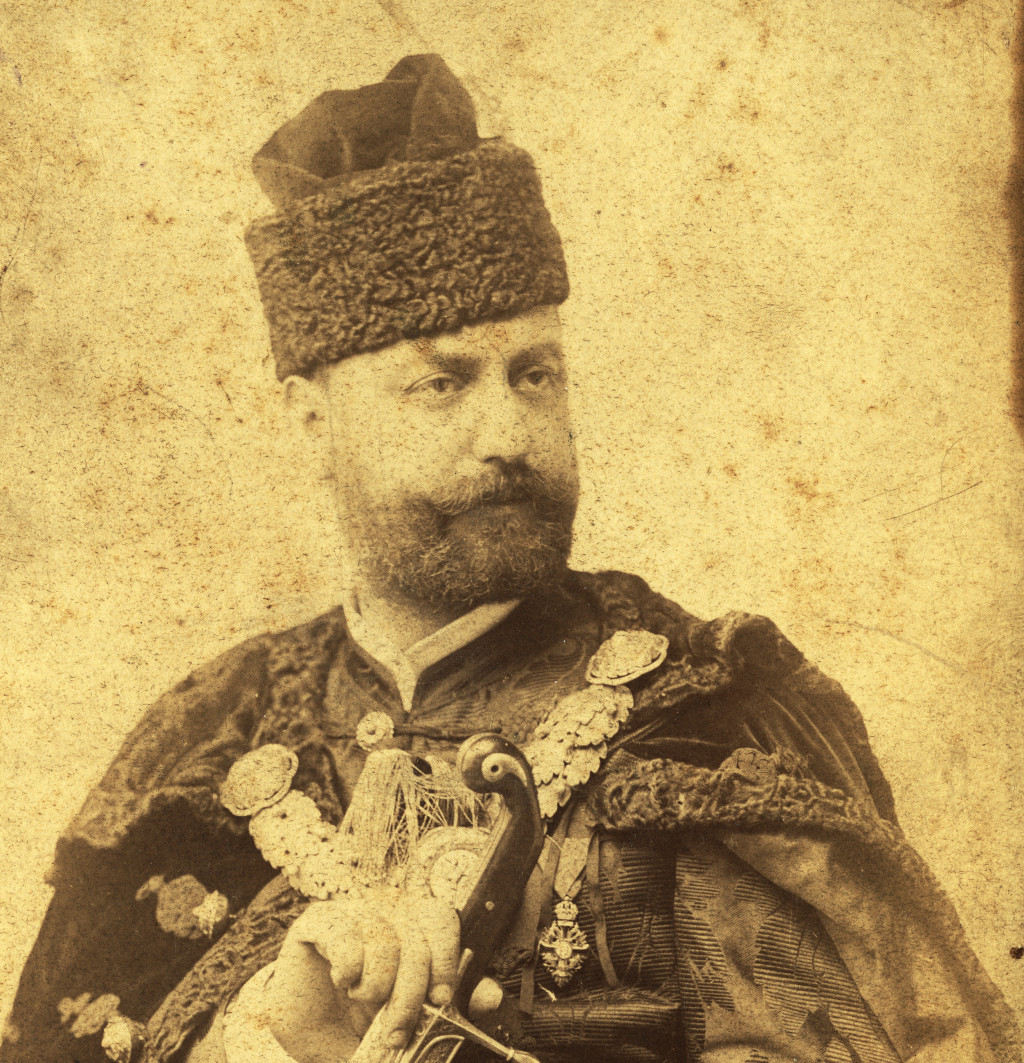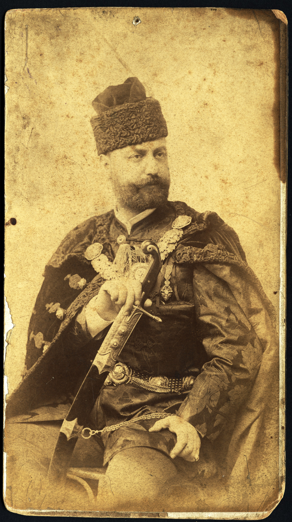 Nagyobb méret, Strelisky műterem, Budapest, ifjabb Perczel Mór (1848-1888) díszmagyarban, Perczel Mór tábornok fia, főnemes, kard, ismert, vasúti mérnök, kitüntetés, érdemrend, monarchia, 1880-as évek, Eredeti kabinetfotó, foltos, tű ütötte lyukkal.