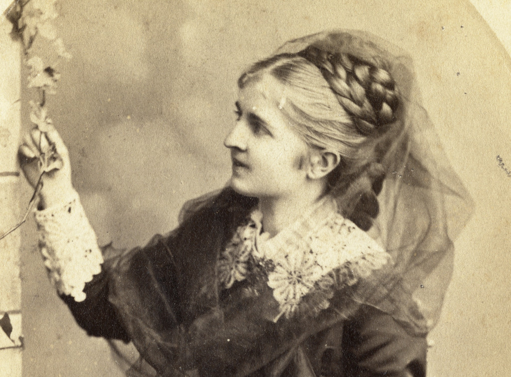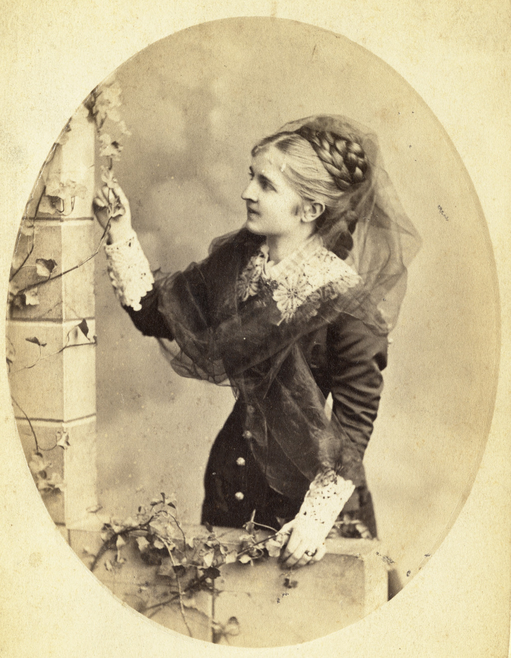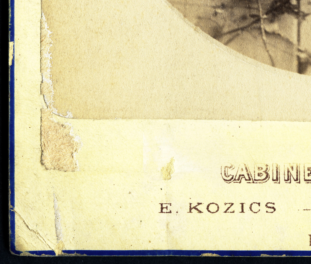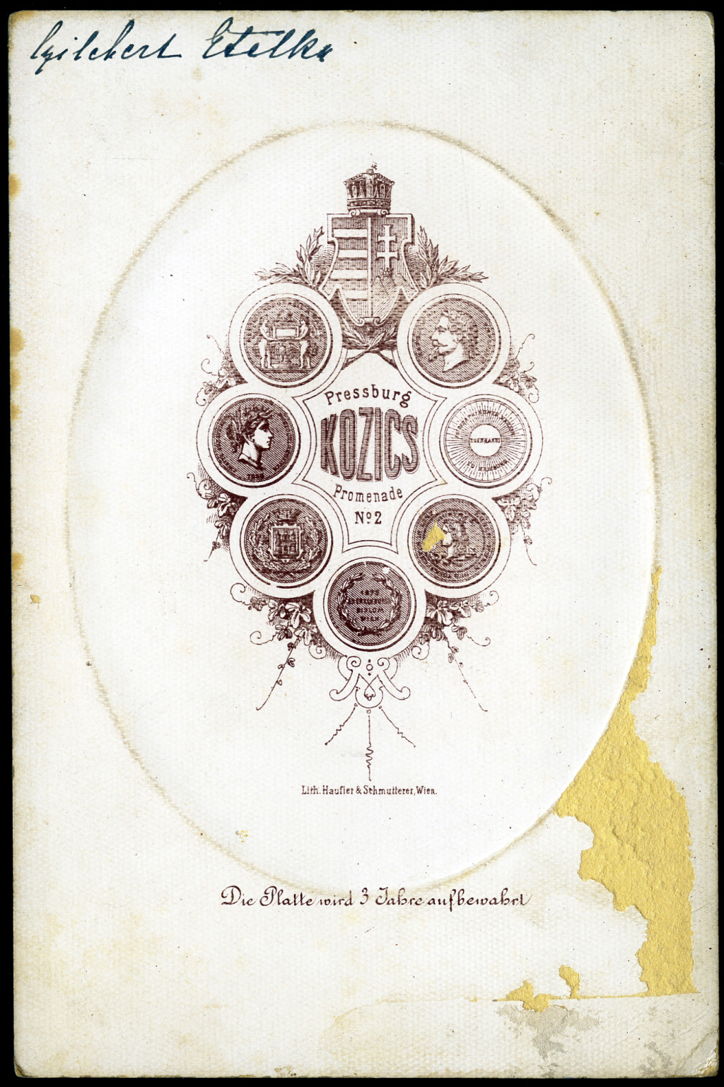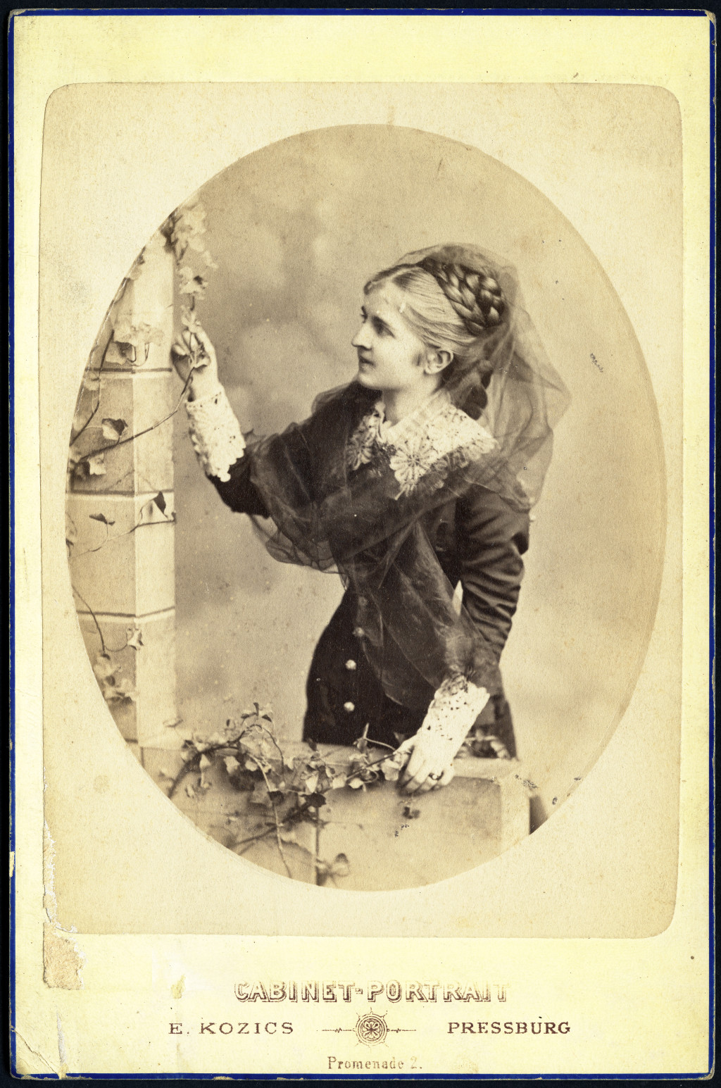 Kozics Ede műterme, Pozsony (Pressburg), Felvidék, Gilebert Etelka portréja, elegáns karcsú nő gyönyörű frizurával, copf, helytörténet, monarchia, 1870-es évek, Eredeti dombornyomott kabinetfotó, felülete sérült, hátulja feliratozott.