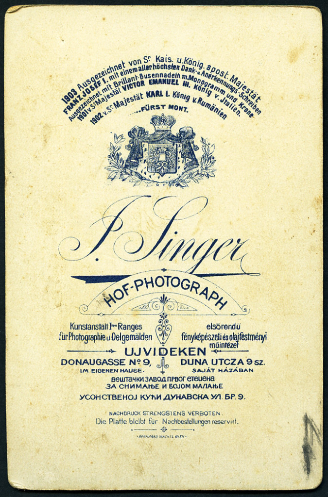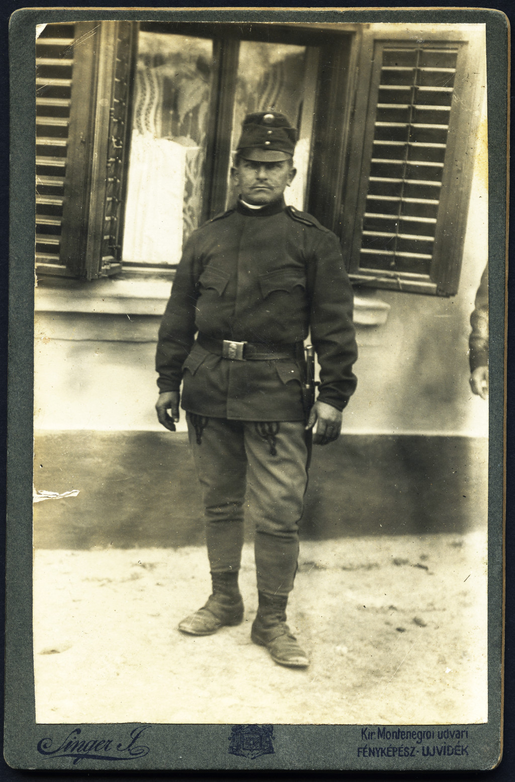 Singer Kir. Montenegrói (???) fényképész, Újvidék, Vajdaság, magyar katona bajonettel, egyenruha, 1. világháború, helytörténet, monarchia, 1910-es évek, Eredeti kabinetfotó érdekes felirattal.