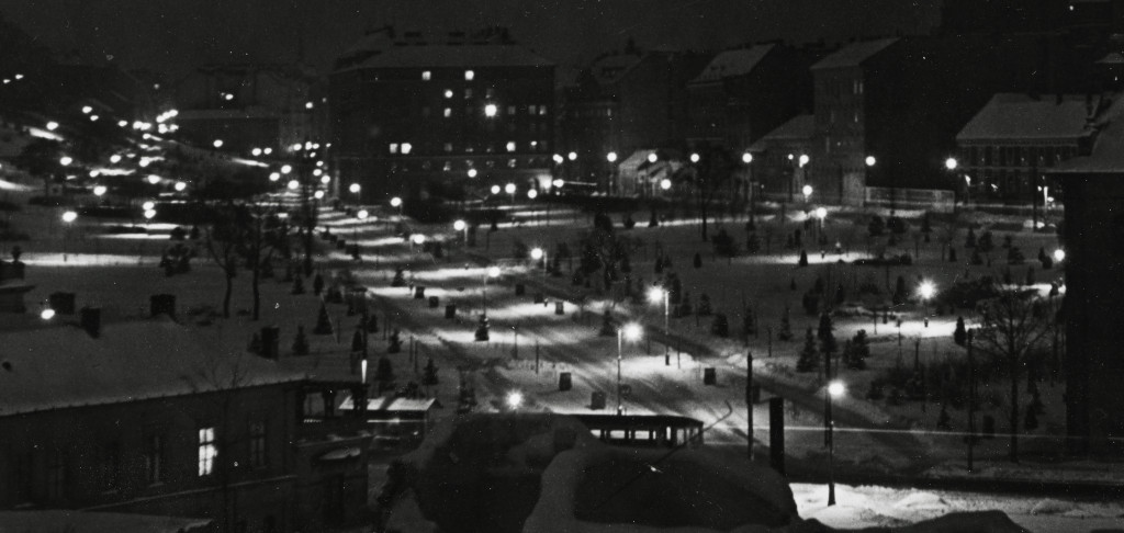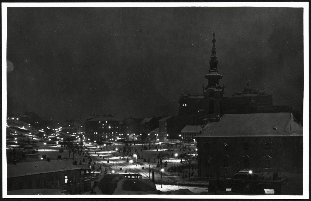 Szendrő István nagyobb méretű jelzett fotója. Este a Tabánban, Budapest, Rác templom, villamos, jármű, közlekedés, Tabán, 1930-as évek, Eredeti pecséttel jelzett fotó, ritka esti felvétel.