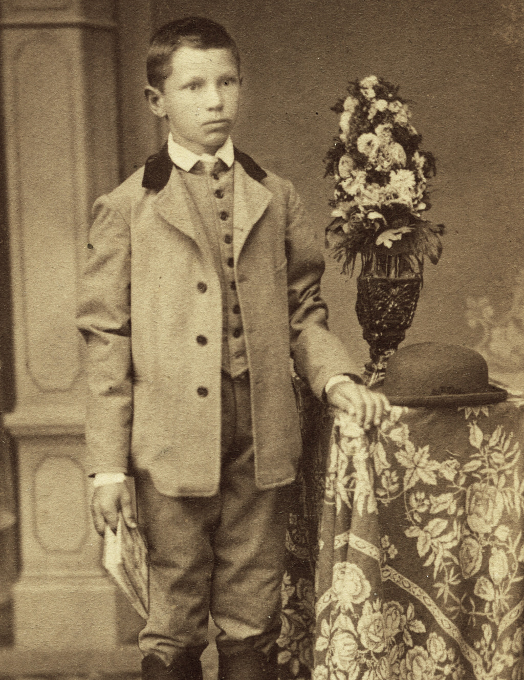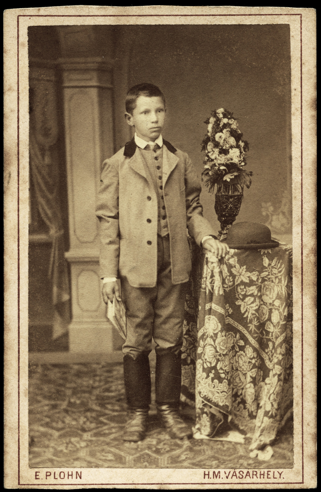 Plohn Illés műterme, Hódmezővásárhely, elegáns fiú csizmában, kalap, könyv, virág, gyerek, monarchia, 1870-es évek, Eredeti CDV, vizitkártya fotó.