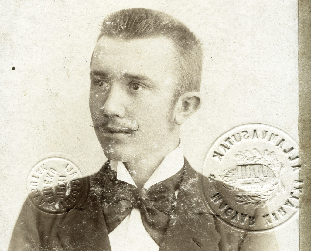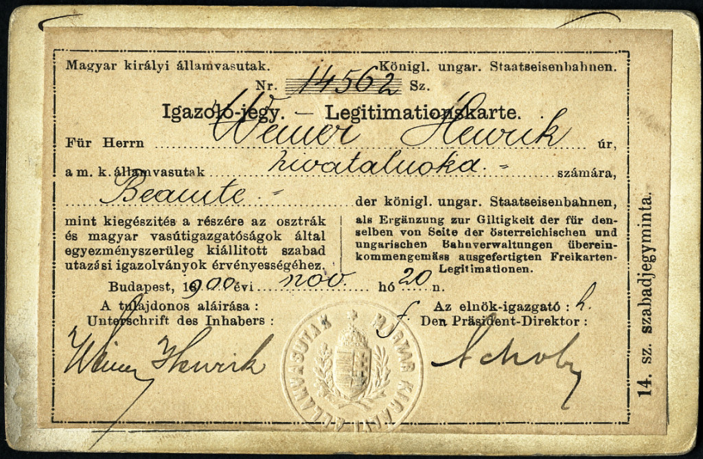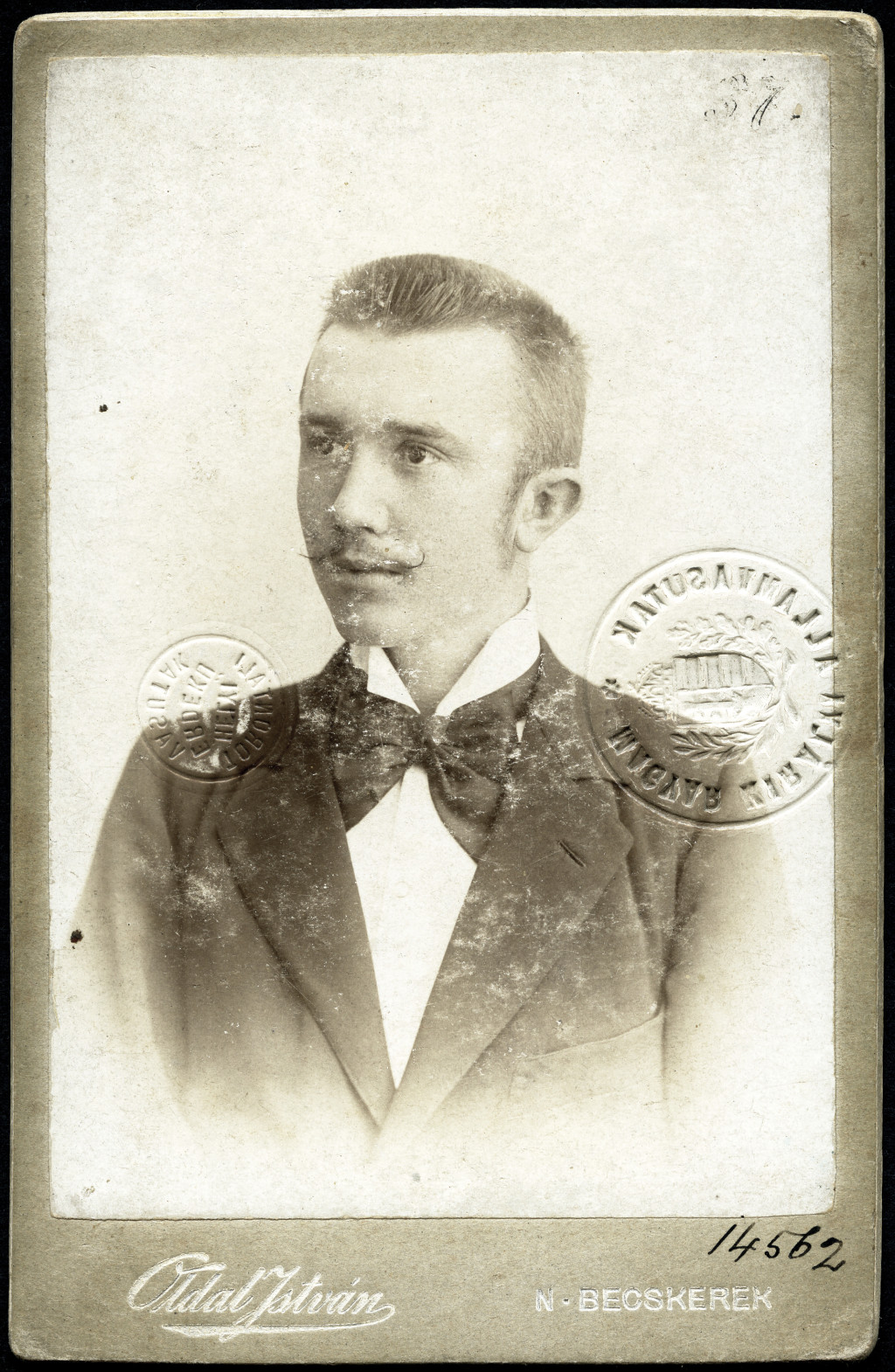 Oldal István műterme, Nagybecskerek, Vajdaság, elegáns fiatal férfi, Weiner Henrik portréja, Torontáli Helyiérdekű Vasutak szárazbélyegzővel, vasúti igazolvány, aláírás, szignó, közlekedés, monarchia, 1900, 1900-as évek, Eredeti CDV, vizitkártya fotó