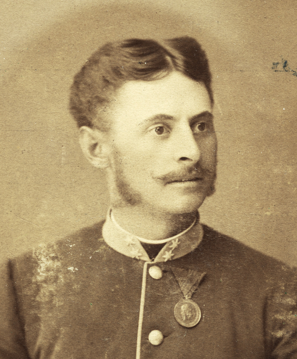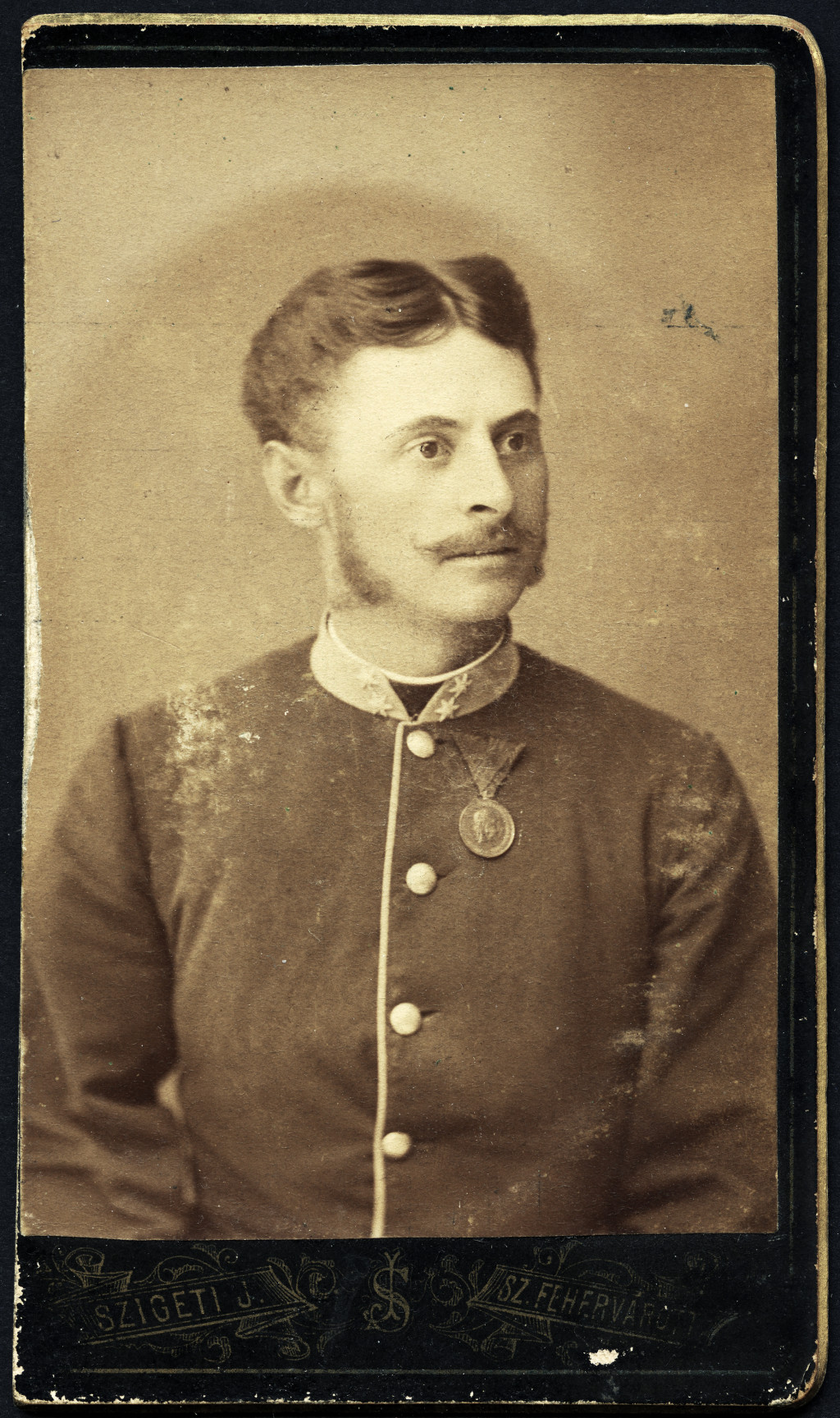 Szigeti J. műterme, Székesfehérvár, egyenruha, Ferencz József emlékérem, kitüntetés, monarchia, 1890-es évek, Eredeti CDV, vizitkártya fotó, széle vágott.