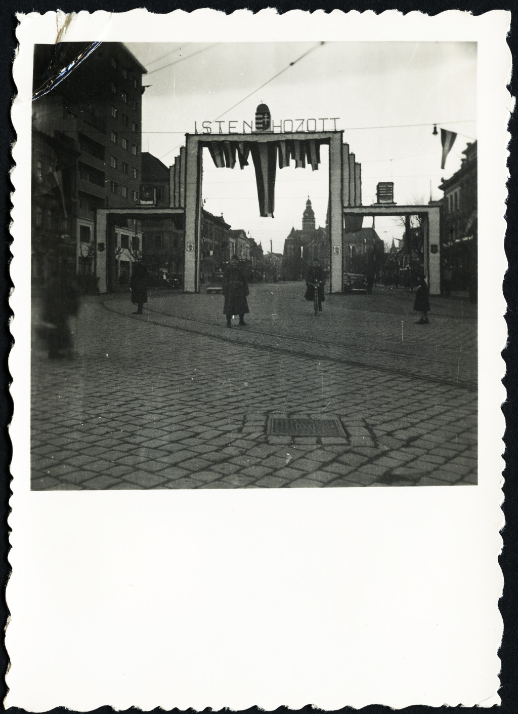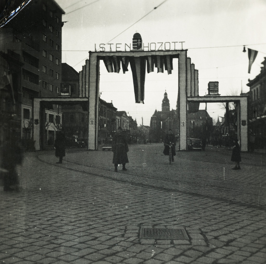 Díszkapu „Isten hozott” felirattal, Kassa, Felvidék, magyar zászlók, magyar katona, bevonulás, egyenruha, 2. világháború, Horthy-korszak, helytörténet, Eredeti fotó, papírkép, felső sarkán gyűrődés.