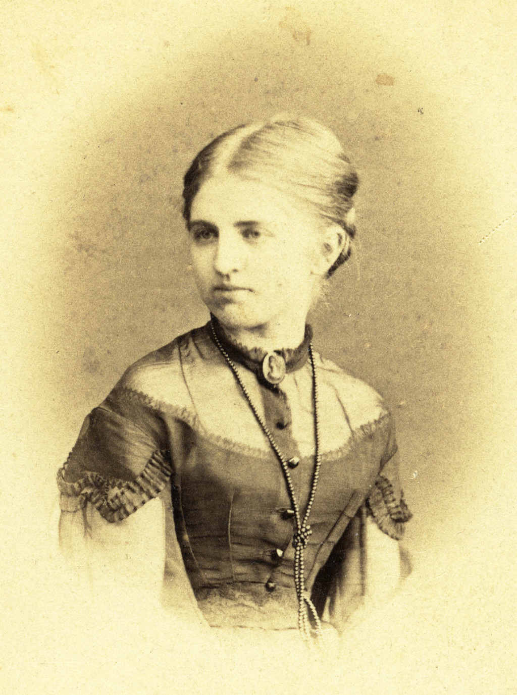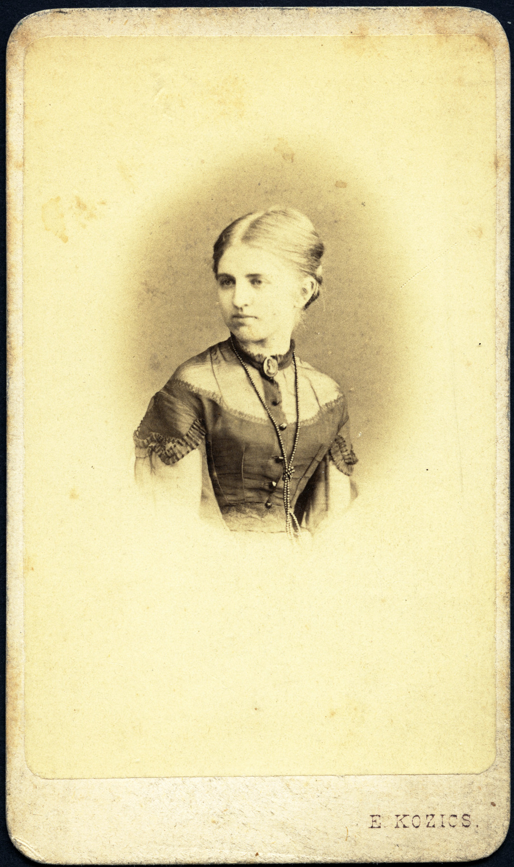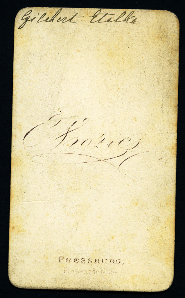 Kozics Ede (Eduard Nepomuk Kozics) műterme, Pozsony (Pressburg), Felvidék, csinos lány, Gilebert Etelka portréja, monarchia, 1860-as évek, Eredeti CDV, hátulján feliratozott vizitkártya fotó.