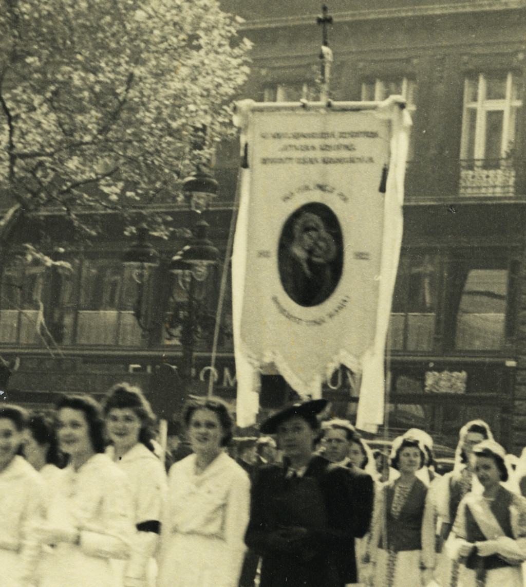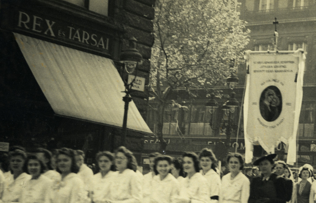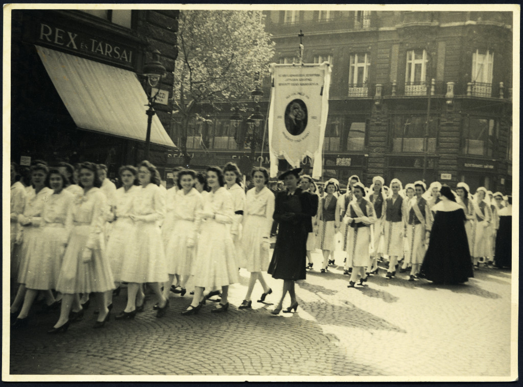 Nagyobb méret, iskolás lányok egyházi zászlóval, Budapest, Váci utca, angol kisasszonyok, apáca, 5. kerület, REX és TÁRSAI reklám, üzlet, kirakat, kereskedelem, Horthy-korszak 1930-as évek, Eredeti fotó, papírkép. méret megközelítőleg (centiméterbe