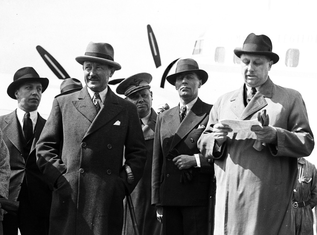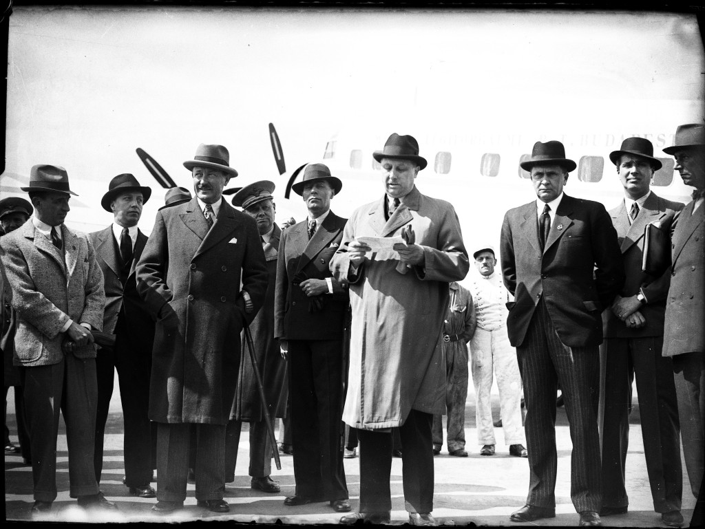 Eredeti üveg NEGATÍV! Álgyay-Hubert Pál államtitkár, vitéz Héjjas Iván, v dr. Grosschmid István a MALERT elnökigazgatója, Orlowsky Leon lengyel nagykövet, repülésügyi szakemberek, Budaörs, repülőtér, repülőgép, Magyar Légiforgalmi RT., Horthy-korsza