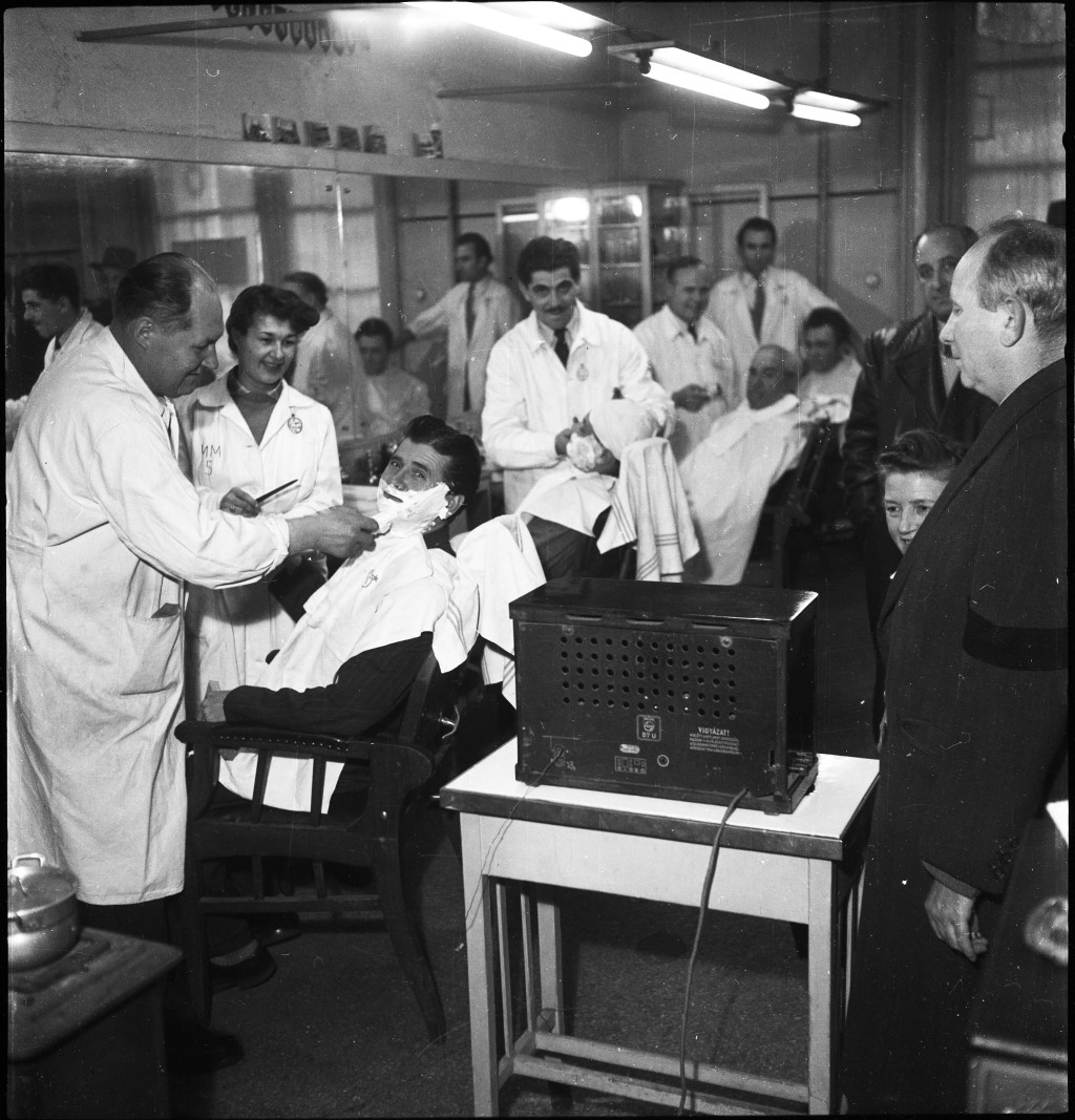 Fotó negatív! Kotnyek Antal fotográfus, Budapest, a londoni magyar-angol labdarúgómérkőzés rádióközvetítését hallgatják egy üzletben, foci, sporttörténet, kommunizmus, 1953, 1950-es évek, Sztálin út 45. alatti fodrászszövetkezet. Eredeti nagyobb mére