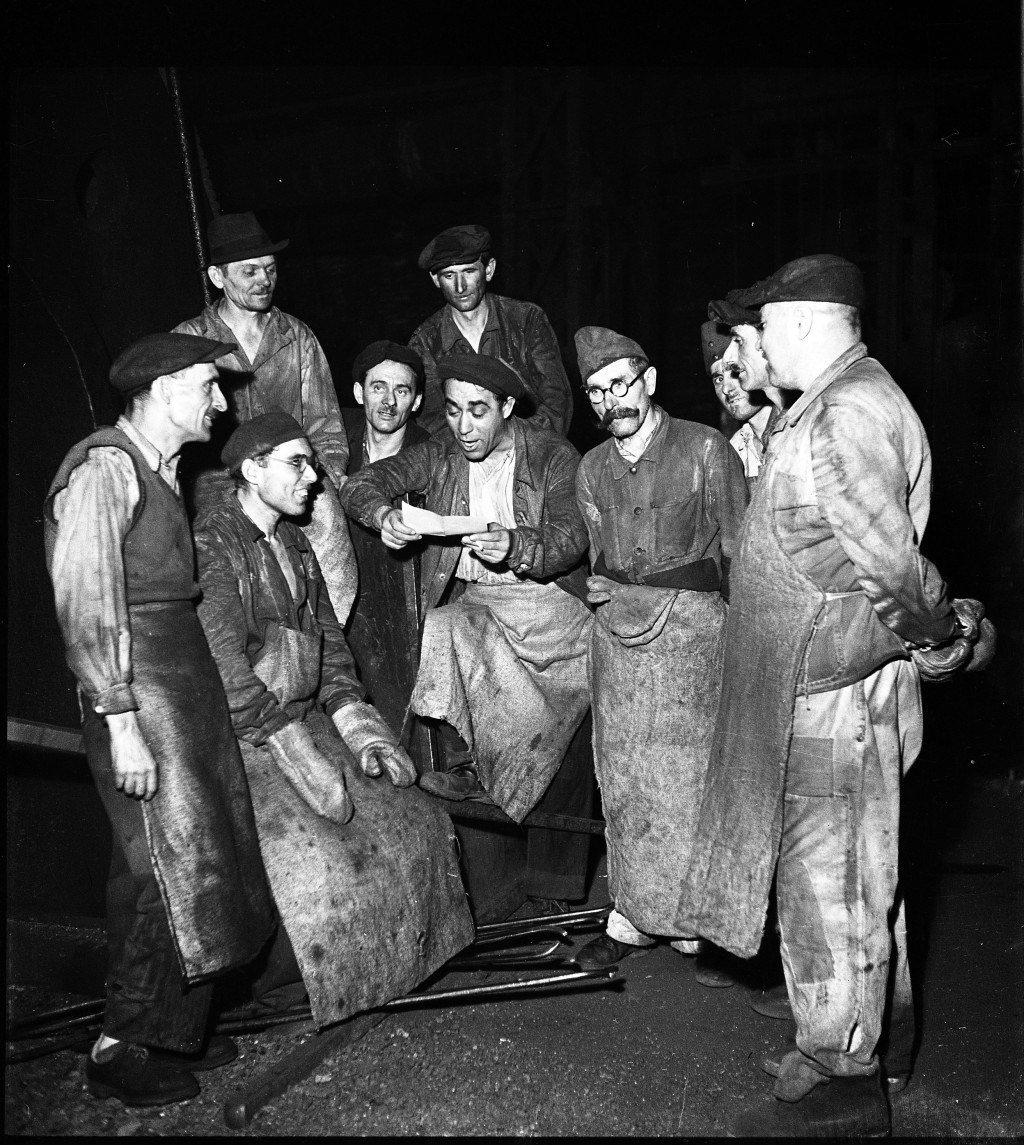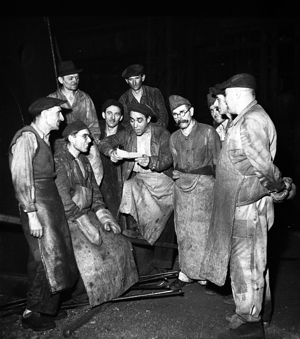 Fotó negatív! Ráth Károly fotográfus, Csepel (Budapest), kohászok pihenés közben, munkás, kohász, gyár, ipar, foglalkozás, kommunizmus, 1951, 1950-es évek, „Elvtársak! Győztünk! harsogott a párttitkár hangja. Évi tervünket a Rákosi Mátyás Művek üzemr